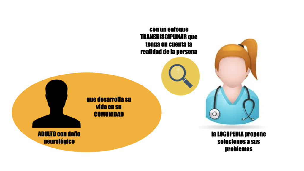 Podríamos definir este enfoque de trabajo como la aplicación de herramientas de prevención, detección, evaluación, diagnóstico y tratamiento de todas las alteraciones de la comunicación y de las funciones orales no verbales (deglución, procesado oral de los alimentos) aplicadas a población adulta con una perspectiva comunitaria con el objetivo de localizar e intervenir en aquellas variables que permitan la transferencia de habilidades y promoción de la salud e incremento de niveles de Calidad de Vida.