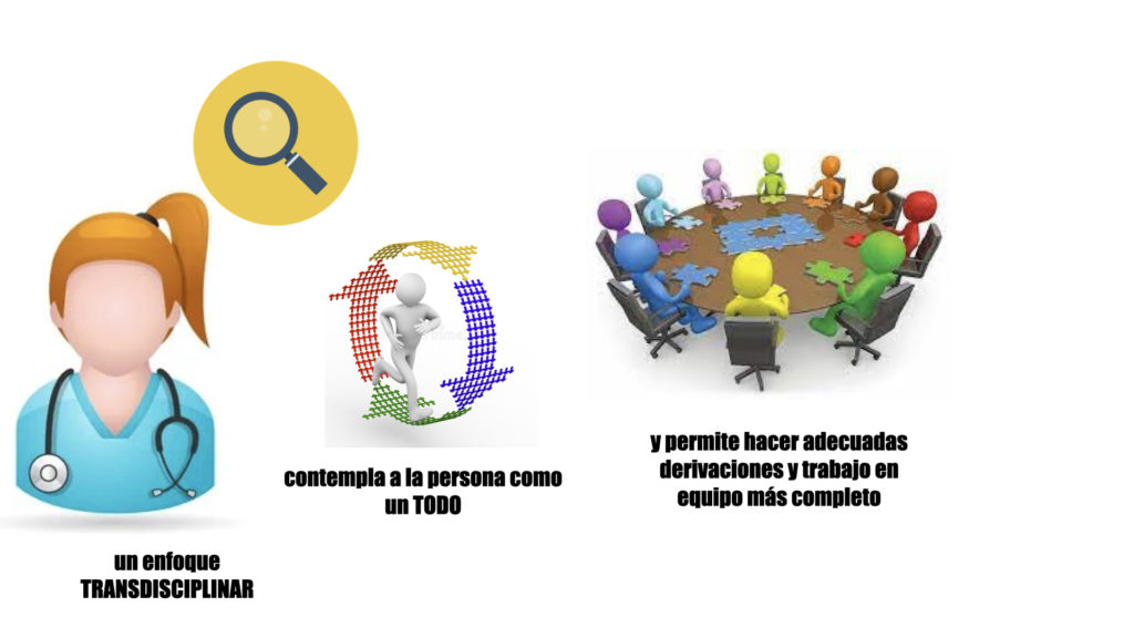 Supone un enfoque holístico de intervención que, por definición, tiene en cuenta a la persona como un todo. Es importante que uno sepa ver más allá de su propia disciplina, teniendo claros sus límites de actuación. Tener en cuenta a su individuo como su totalidad permite detectar donde se encuentra la raíz del problema y favorecer una derivación más efectiva hacia el profesional que más aportará a la persona.